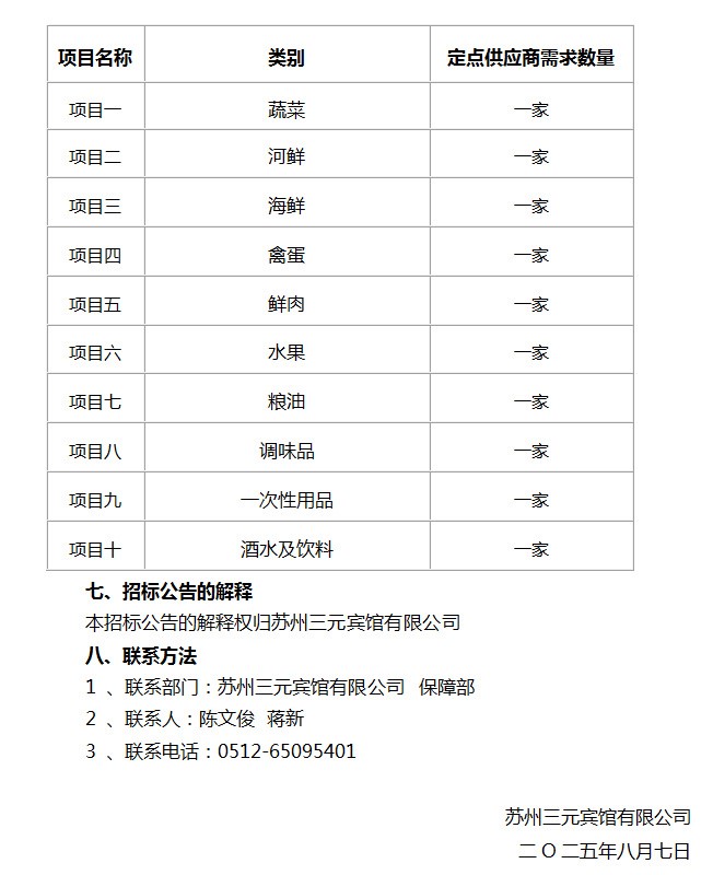 根据“苏州卫生职业技术学院”相关招投标规定,168官方开奖官网在线就《蔬菜》、《河鲜》、《海鲜》、《禽蛋》、《鲜肉》、《水果》、《粮油》、《调味品》、《一次性用品》、《酒水及饮料》等定点采购供应商选定项目进行公开招标,欢迎符合条件的投标人参加,具体内容如下: