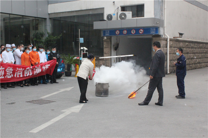 随后,疏散到广场的全体员工进行了灭火演练,主要是灭火器使用、灭火操作和义务消防员进行消防水带放接使用,要求员工掌握使用灭火器,并要以最快的时间灭掉火源。