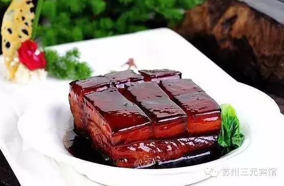 苏州人一年中不能错过四块肉,第一块就是这酱汁肉,其中以陆稿荐的酱汁肉最为出名。清明前后,苏州人的餐桌上一定会有它的影子。酱汁肉最诱人的就是通红的色泽,这颜色让慵懒了一冬天的人胃口大开。酱汁肉的摆盘也是很讲究的,这样的搭配才是色香味俱全。今年三元宾馆特别推出可以外带的酱汁肉,400克只要40元哦!