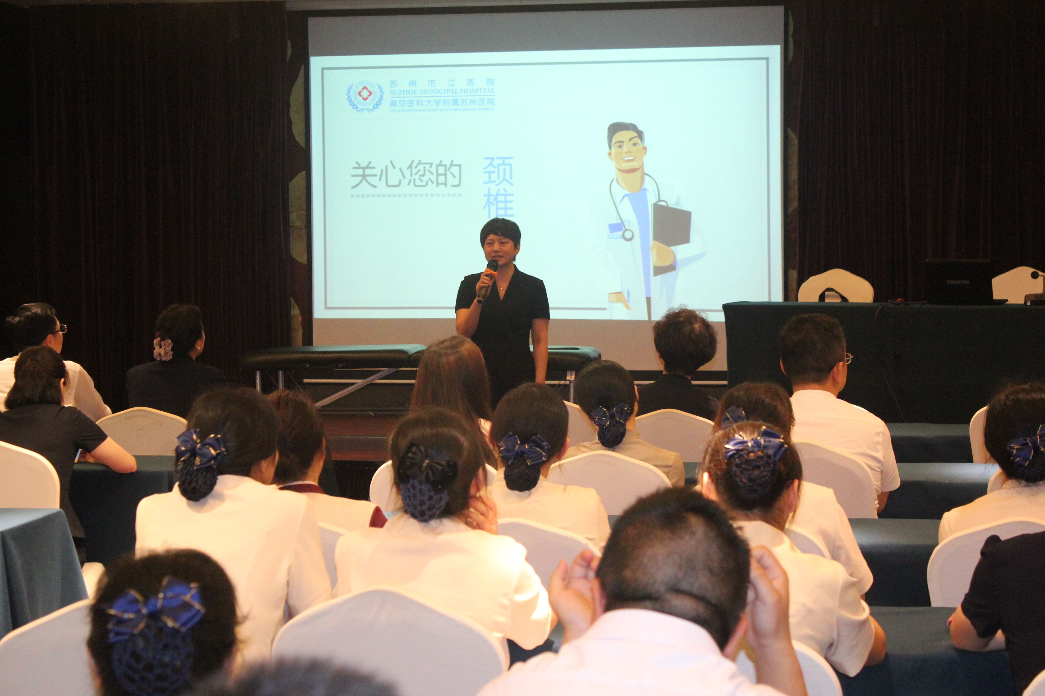 为了使教职工养成良好的生活、工作习惯,增强认识、预防和治疗颈腰椎等慢性疾病的能力和意识,提高健康素养,改善生活质量。酒店管理系(三元宾馆)分工会于2019621日下午,在宾馆四楼多功能厅举办主题为《颈腰椎病的治疗预防》的健康知识讲座。特邀苏州市市立医院本部康复医学科翁主任和张主任主讲。