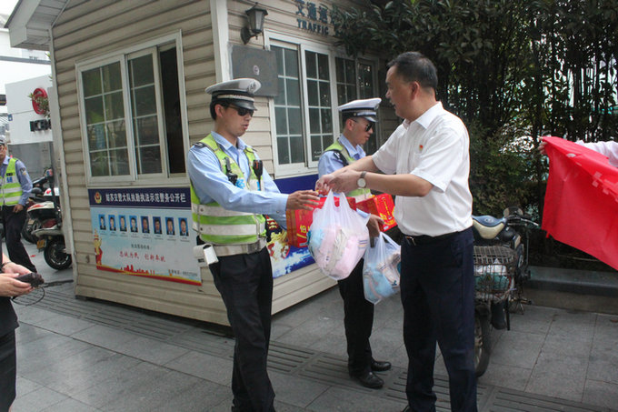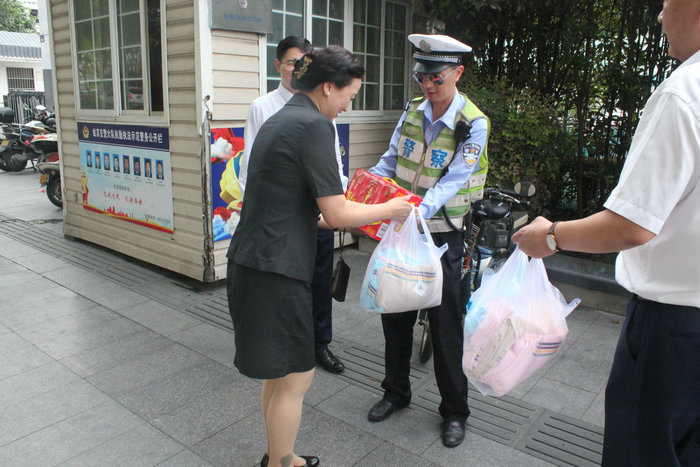 炎炎夏日送清凉,丝丝关怀暖人心。连日来,苏州持续出现高温闷热天气,给城市道路交通管理工作带来了一定压力,为确保市区道路安全畅通,全体执勤交警坚守岗位,保障群众安全出行。为表达对一线交警的敬意和慰问,722日上午,苏州卫生职业技术学院酒管系(三元宾馆)党总支第一党支部开展了“情系一线,清凉一夏清凉公益行动主题党日活动,赴饮马桥交警岗亭慰问奋战在烈日下的姑苏区交警七中队一线交警。