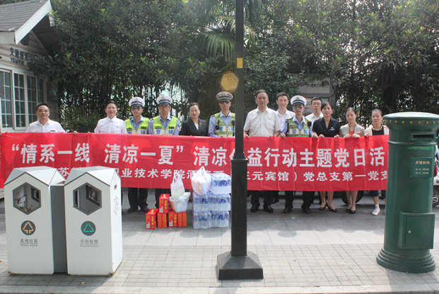 一支部全体党员在党总支书记强佩华、支部书记俞险峰的带领下来到饮马桥岗亭,将矿泉水、风油精、毛巾、饮料等防暑降温用品送到执勤民警手中。姑苏区交警七中队长王俊与前往的党员同志们一一握手表示感谢,感谢苏州卫生职业技术学院酒管系(三元宾馆)党总支第一党支部炎炎夏日为他们一线交警送去清凉和慰问,感谢苏州卫生职业技术学院酒管系(三元宾馆)党总支第一党支部对一线执勤交警的真诚关切和对公安交管工作的支持厚爱。
