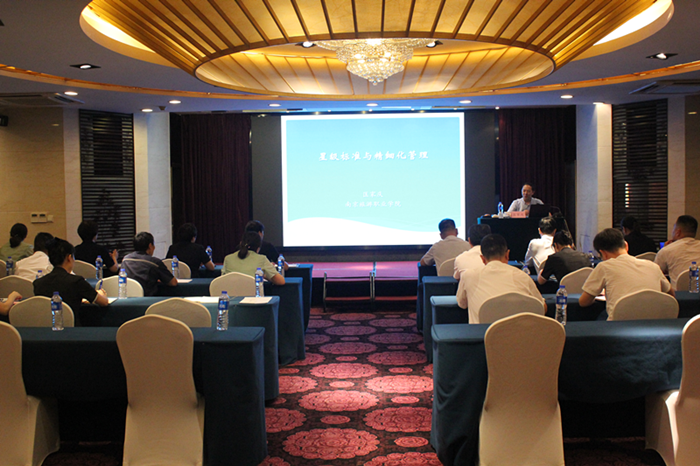 匡家庆教授做了《星级标准与精细化管理》的报告。他结合复核工作实际案例,从星级标准必备项目检查表、设备设施评分表、饭店运营质量评价表等三个方面做了独到讲解,从新标准特点的“六个强调”到必备项目检查的要点、再到关注三个环节的落实情况,详细阐释了复核工作的意义、要求、方法、工作流程等内容,将精细化管理内容穿插在星级标准的解说中,课程讲解过程中匡教授理论联系实际,讲课生动有趣,课堂气氛十分活跃。