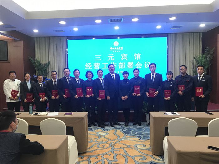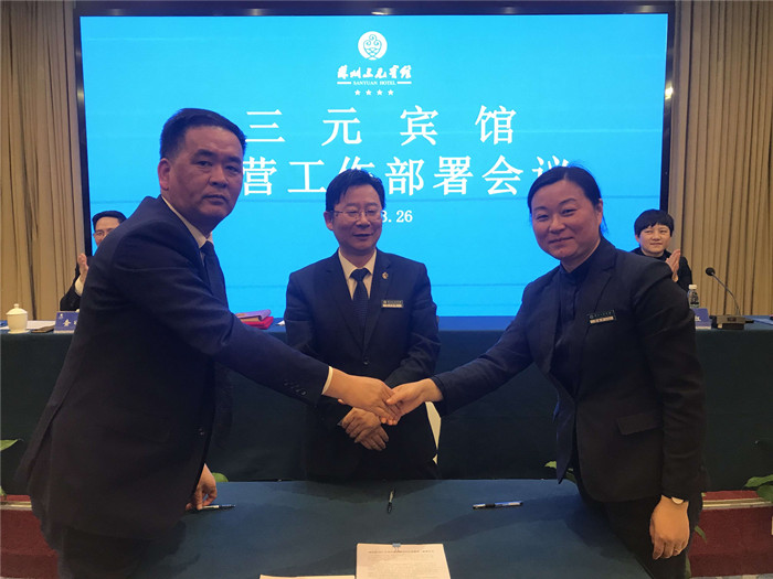 随着春天的到来,万物复苏,宾馆第一个季度的经营工作也即将过去,目前新冠病毒疫情已基本得到控制,宾馆需要为即将复苏的经营及早做好准备和动员,打好翻身仗,把失去的损失弥补回来。3月26日下午,三元宾馆在报告厅召开经营工作部署会议,会议由总经理助理查以忠同志主持。会上,总经理俞险峰同志对2021年宾馆经营管理工作实施方案进行详细解读,宣读2021年宾馆管理人员聘任决定并颁发聘任证书。会上还签订了2021年经营部门经济责任书以及党风廉政和行风建设二级责任书,两个经营部门营业部、餐饮部和一个后勤保障部门工程部的部门经理代表作表态发言,将2021年宾馆经营工作的部署责任落实到位,从思想政治、经济责任、管理考核、运营保障等各方面确保经营工作的顺利开展。