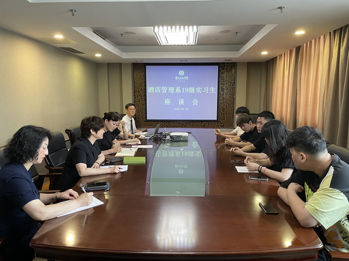 7月2日上午,三元宾馆在三楼会议室召开酒管系19级实习生座谈会。出席座谈会的有酒店管理系党总支书记强佩华、系部副主任沈洁红、三元宾馆相关管理人员以及酒管19级五位实习生同学,会议由系部主任沈洁红主持。