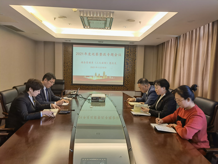 11月15日上午,酒店管理系(三元宾馆)党总支在宾馆三楼会议室召开2021年度巡查整改专题会议。酒店管理系(三元宾馆)党总支全体委员参加了会议,会议由党总支书记强佩华主持。