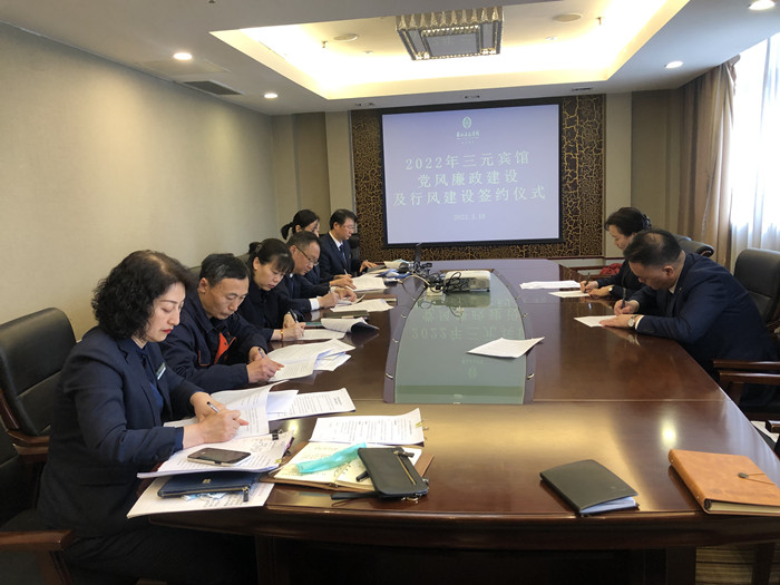 今年春节后苏州爆发的疫情,使酒店行业都被迫按下了暂停键,三元宾馆的经营也受到很大的冲击,面临着前所未有的困境。在四面楚歌之时,宾馆一边为坚持防疫做贡献,一边为即将复苏的经营做准备。 3月18日上午,宾馆组织部门经理以上管理人员,召开2022年度经营工作部署会议暨党风廉政建设及行风建设签约仪式。会上,总经理俞险峰同志对宾馆2022年经营管理工作计划作了详细解读和部署,总支书记强佩华同志强调了抓好党风廉政建设和行风建设、政治思想和意识形态工作的重要性和必要性,安全责任、风险防控的层层布置与落实,党员干部、管理人员需增强廉政意识、廉洁自律、履行“一岗双责”、担负主体责任和监督责任,为宾馆经营工作做好保障。会上签署了2022年度经济责任书、党风廉政建设和行风建设二级责任书、治安消防安全二级责任书、思想政治与意识形态工作二级责任书以及管理人员自律承诺书。